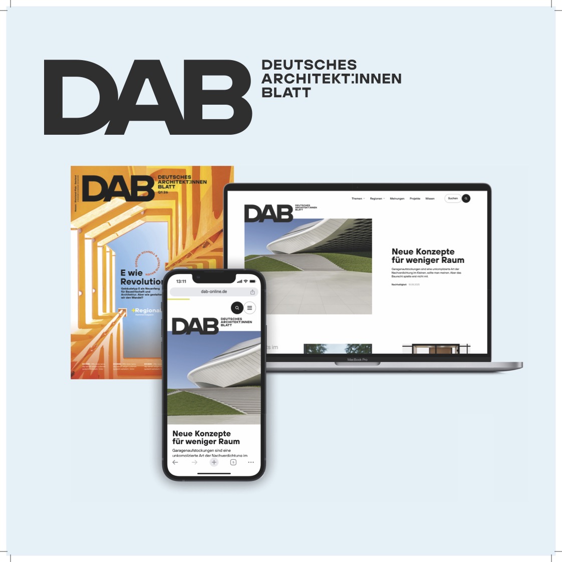 Das Deutsche Architekt:innenblatt (DAB) ist das gemeinsame Fach- und Mitgliedermagazin der Bundesarchitektenkammer (BAK) und der Landesarchitektenkammern (LAK). Es richtet sich an Architekt:innen, Stadtplaner:innen, Innen- und Landschaftsarchitekt:innen und beleuchtet Themen, die den Berufsstand bewegen – von Baukultur, Politik und Berufspraxis bis zu Nachhaltigkeit und digitaler Transformation